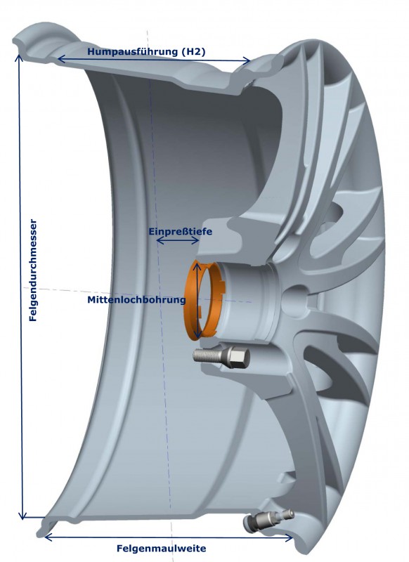 Einpresstiefe: Mit Einpresstiefe (ET) bezeichnet man den Abstand zwischen der Felgenmitte (gemessen zwischen den Felgenhörnern) und der inneren Auflagefläche der Felge auf der Radnabe. Die Angabe der Einpresstiefe erfolgt in "mm". Bei einer ET "0" reicht die Felge exakt so weit nach innen wie nach außen. Bei einer positiven ET (+35mm) bewegt sich die Felge um 35mm weiter nach innen zum Fahrzeug. Mittenlochbohrung: Die Mittenlochbohrung der Felge ist für die Zentrierung am Fahrzeug zuständig. Mittels Zentrierring wird die Felge auf den jeweiligen Nabendurchmesser des Autos angepasst. Felgengröße: Durch den Felgendurchmesser und die Felgenmaulweite wird die Größe der Felge festgelegt. Die Angabe zur Felgengröße erfolgt in "Zoll" (1 Zoll = 25,4mm). Die Felgenbreite (Felgenmaulweite) wird zwischen den Felgenhörnern gemessen. |